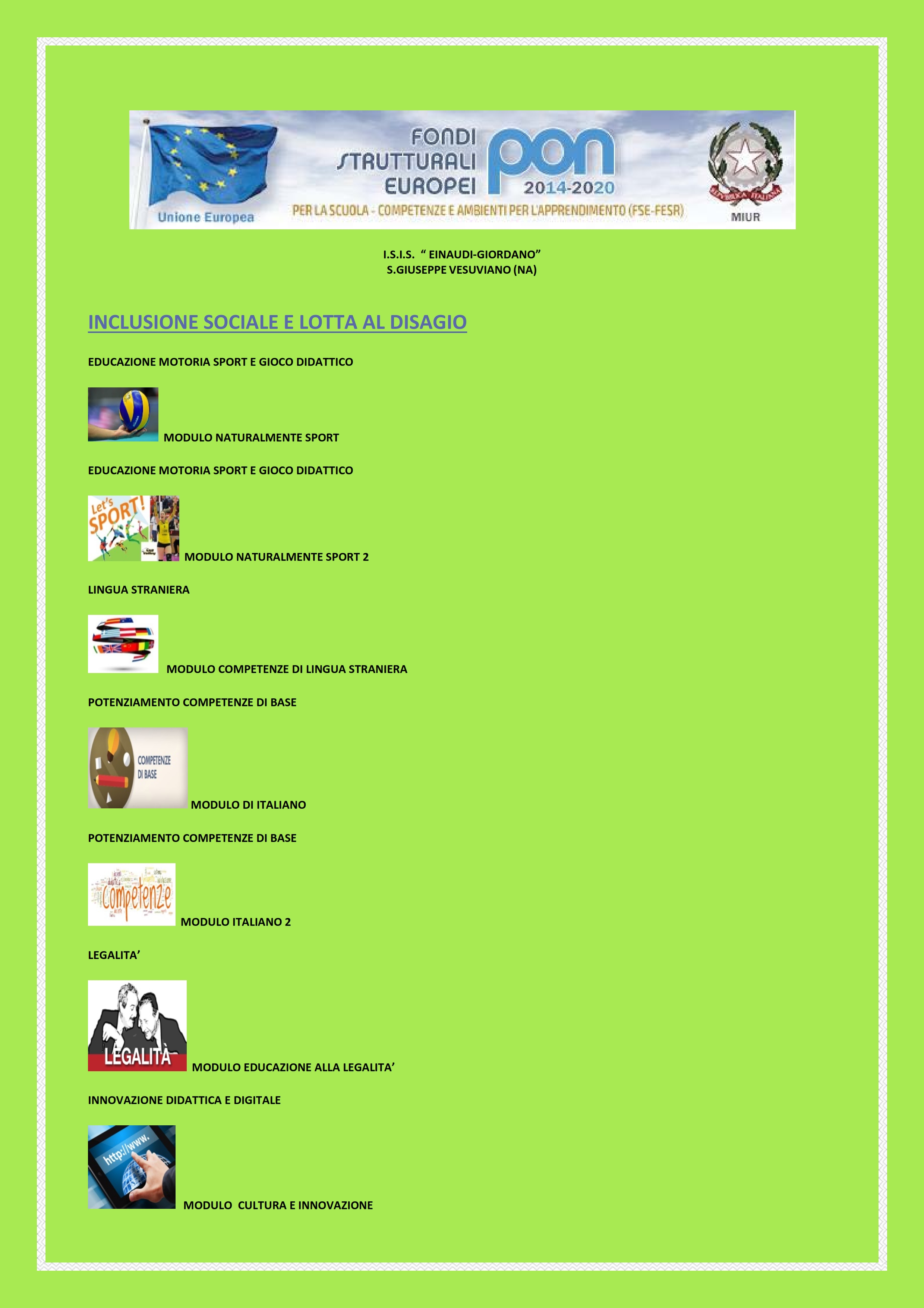 Nell'ottica dei Fondi Strutturali Europei – Programma Operativo Nazionale “Per la scuola, competenze e ambienti per l’apprendimento” 2014-2020. Avviso pubblico 10862 del 16/09/2016 “Progetti di inclusione sociale e lotta al disagio nonché per garantire l’apertura delle scuole oltre l’orario scolastico soprattutto nelle aree a rischio e in quelle periferiche”. Asse I – Istruzione – Fondo Sociale Europeo (FSE). Obiettivo specifico 10.1. – Riduzione del fallimento formativo precoce e della dispersione scolastica e formativa. Azione 10.1.1 – Interventi di sostegno agli studenti caratterizzati da particolari fragilità. Attuazione delle attività dei moduli formativi; l'I.S.I.S. "Einaudi-Giordano" ha stipulato le seguenti convenzioni:
